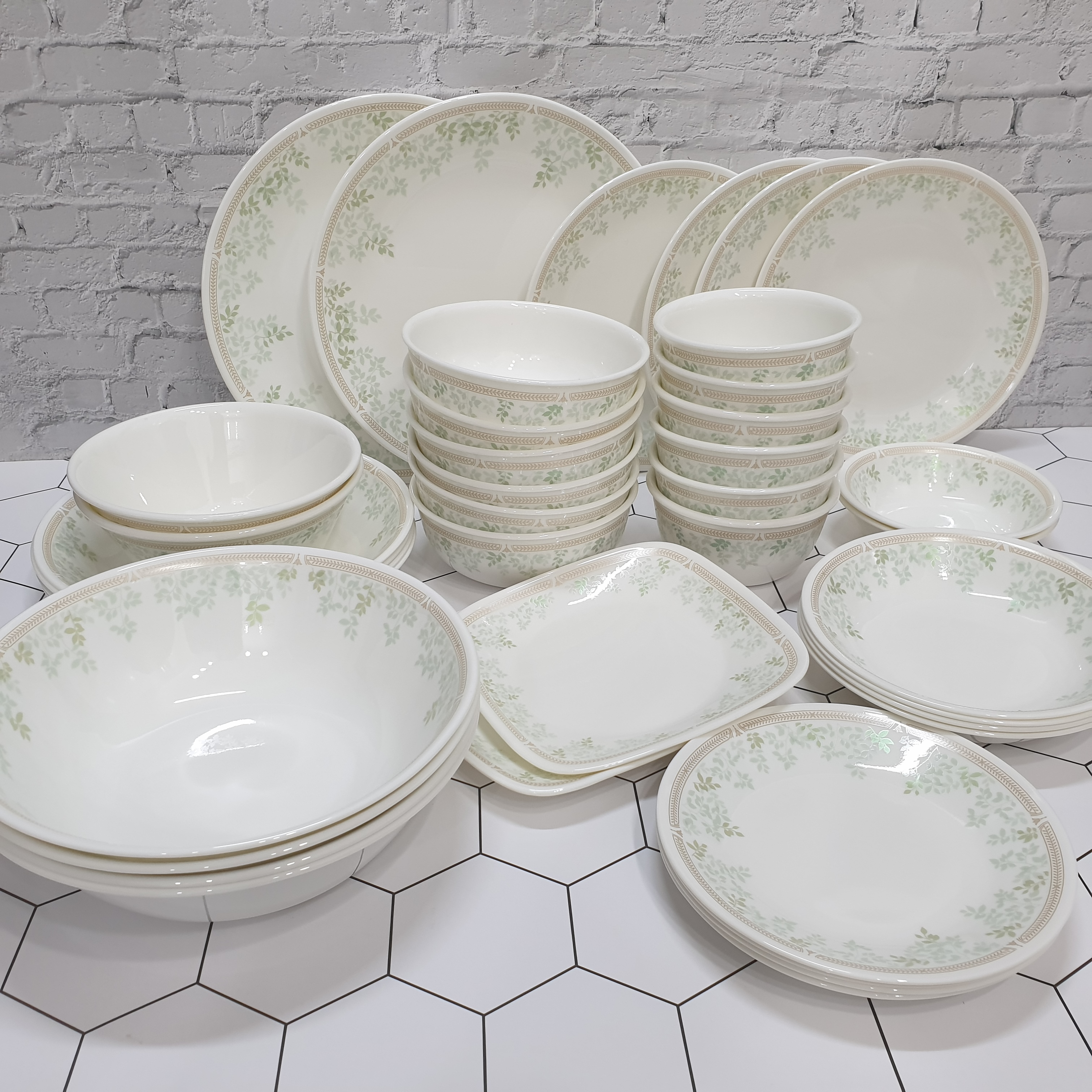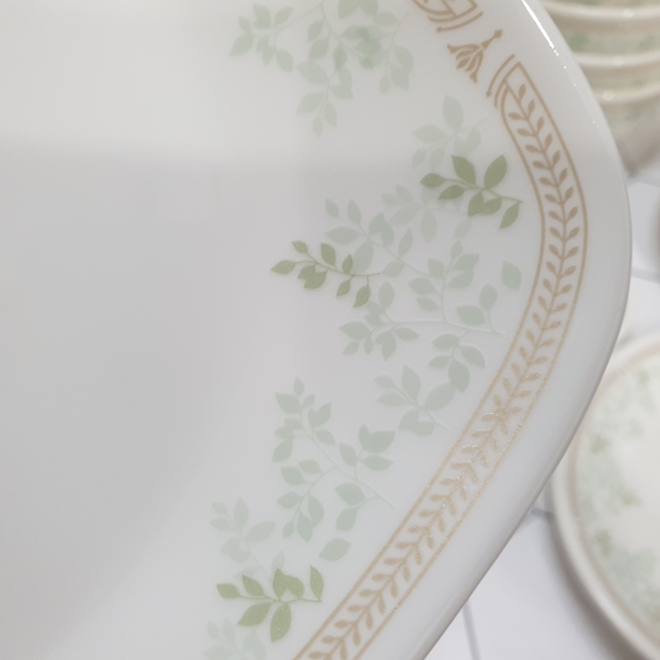 민트 리브즈는 입사귀의 컬러가 레이어로 명암이 있어서 입체감이 느껴지고 자연스러워 보입니다. 제가 홈쇼핑 온라인에서 구입한 6인 세트는 구성이 꽤 괜찮습니다. 4각 접시도 작은 사이즈로 포함되어 있고 면기가 4개 포함되어서 4인 가족이 사용하기에 괜찮은 구성이었어요.